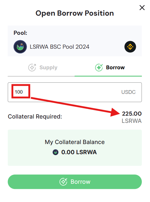 The process of borrowing USDC by pawning your LSRWA and LAND tokens is straightforward. Let’s walk through it: