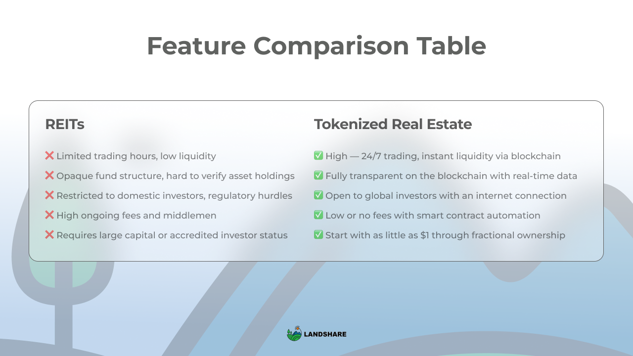 В то время как инвестиционные трасты в недвижимость (REIT) долгое время служили вратами для долевого владения недвижимостью, новая волна платформ для инвестиций в недвижимость на базе блокчейн предлагает то, чего REIT не могли предложить — глобальный доступ, ликвидность 24/7 и полную прозрачность. Это эпоха токенизации, и такие платформы, как TokenLand, ведут её.
